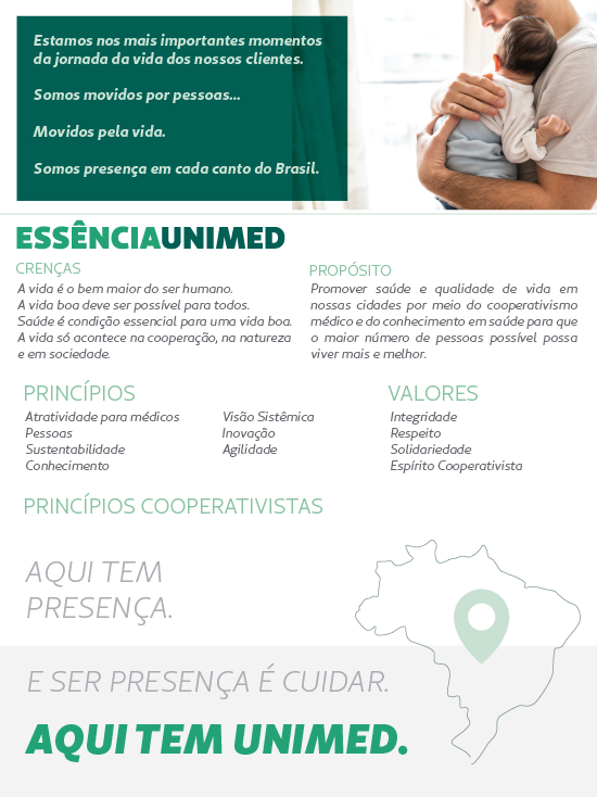 O Sistema Unimed tem uma nova identidade organizacional. Batizada de Essência Unimed, ela resgata elementos da nossa cultura e da história, ressignificando o propósito da marca frente aos desafios atuais. “Aqui tem Unimed” é o conceito central que sintetiza os compromissos de cuidado com a saúde, cooperação e presença ativa nas nossas cidades.