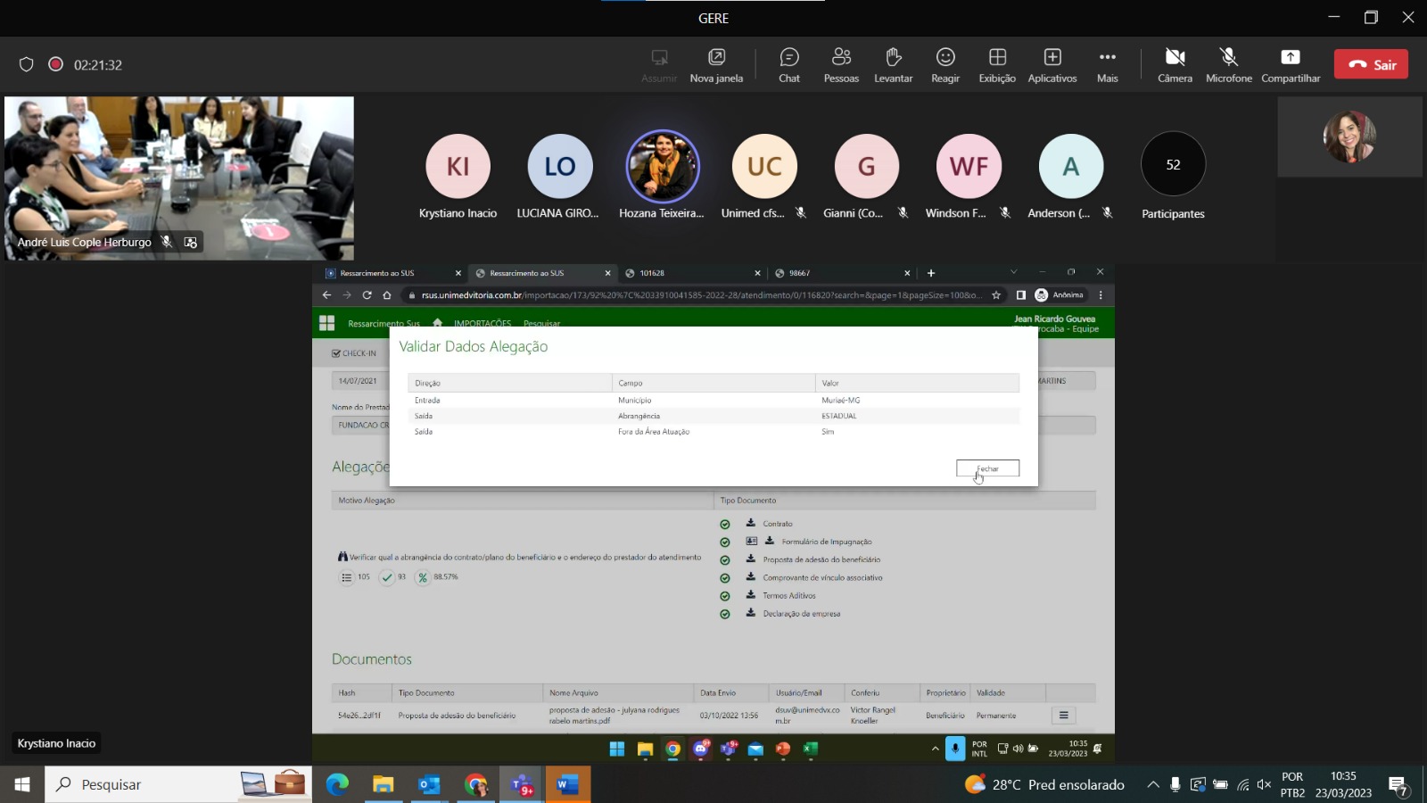 Foi realizado, no dia 23 de março, o encontro do Grupo Estadual de Regulação (GERE), em formato virtual, que reuniu cerca de 60 representantes das 16 Unimeds do estado. A gerente de Regulação da Federação Rio, Ana Paula Polli, e o colaborador da empresa Cube, fornecedora da cooperativa, Krystiano Inácio, apresentaram o novo sistema de gestão para as tratativas de ressarcimento ao SUS, o RSUS.