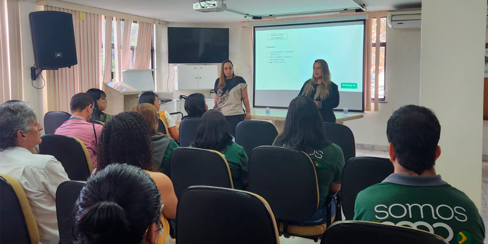 Durante os dias 1° e 2 de agosto, a coordenadora de Mercado da Unimed Ferj, Marianny Mesquita, e a analista de Sustentabilidade, Juliana Condis, aplicam o treinamento sobre as diretrizes da marca e o Código de Conduta do Sistema Unimed, para cerca de 180 colaboradores da Unimed Araruama.