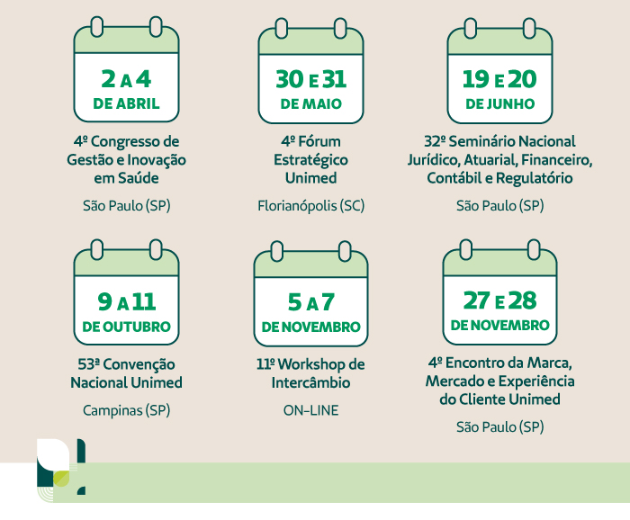 A gente quer se conectar cada vez mais para compartilhar conhecimento e experiências e cooperar para a evolução e perenidade do Sistema Unimed. Confira o calendário de eventos da Unimed do Brasil para o próximo ano, reserve sua agenda e garanta a sua participação. Até lá!