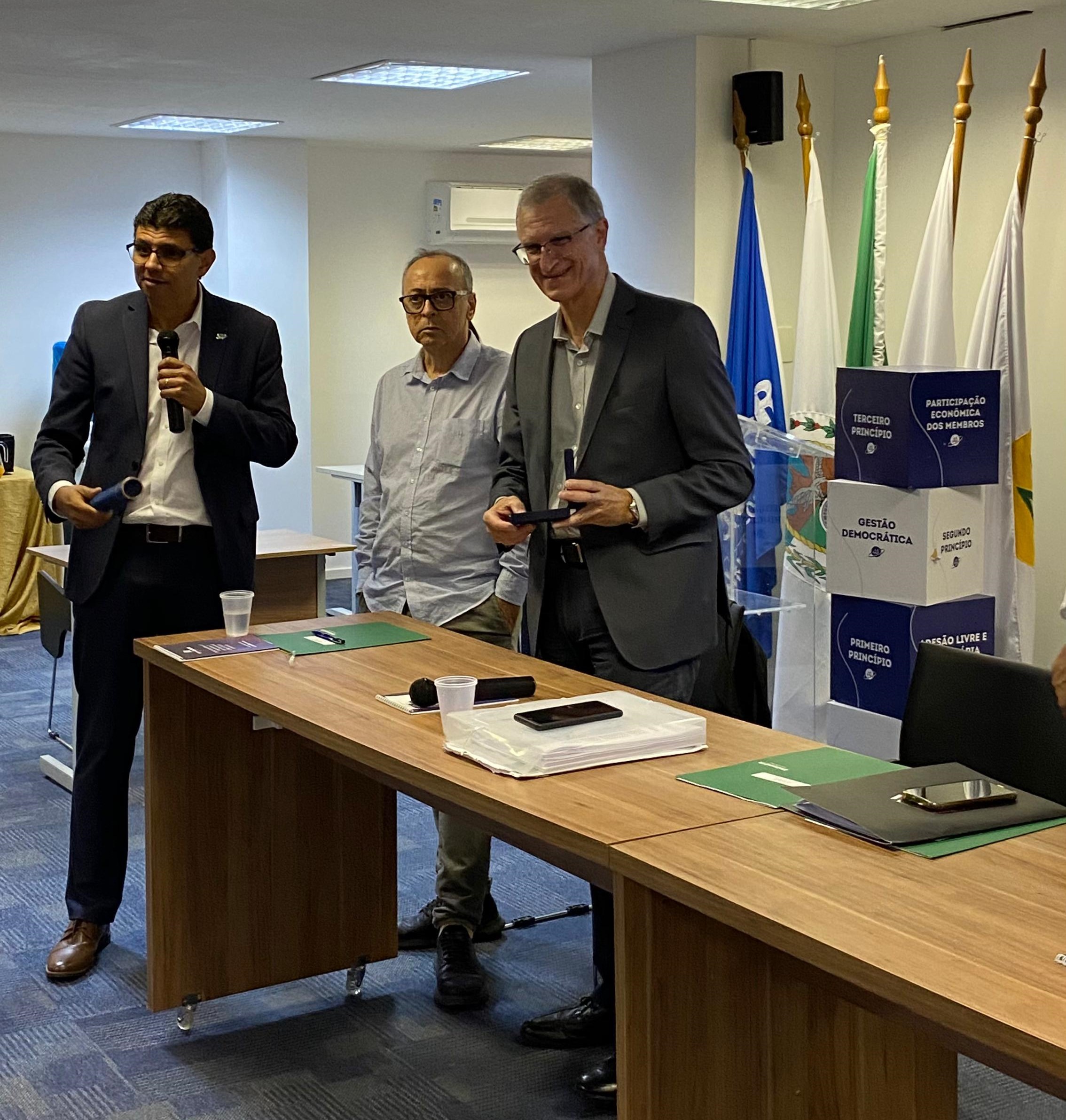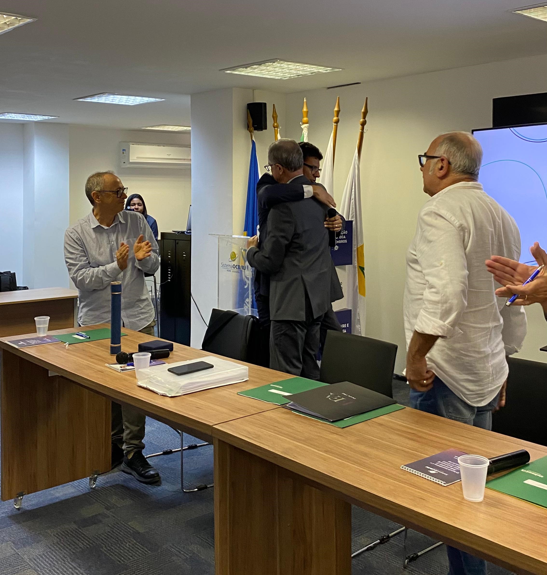 “Na última Conferência Rio Mais Coop, realizada no fim do ano passado, homenageamos as pessoas e instituições que se destacaram ao longo de 2023, em defesa do cooperativismo, buscando a unidade e a promoção das cooperativas. O presidente João Alberto foi um dos escolhidos e por motivo de viagem, não pôde comparecer ao evento. Fico muito feliz por poder entregar a medalha na presença das Unimeds, pois sei o esforço pessoal que ele tem feito em prol dessa migração da carteira da Unimed Rio. Vocês têm realmente uma responsabilidade muito grande. Temos a clara percepção de que estão ajudando a manter o patamar que o cooperativismo do Rio alcançou nos últimos anos”, comentou o presidente do Sistema OCB/RJ, que também explicou a origem da medalha.