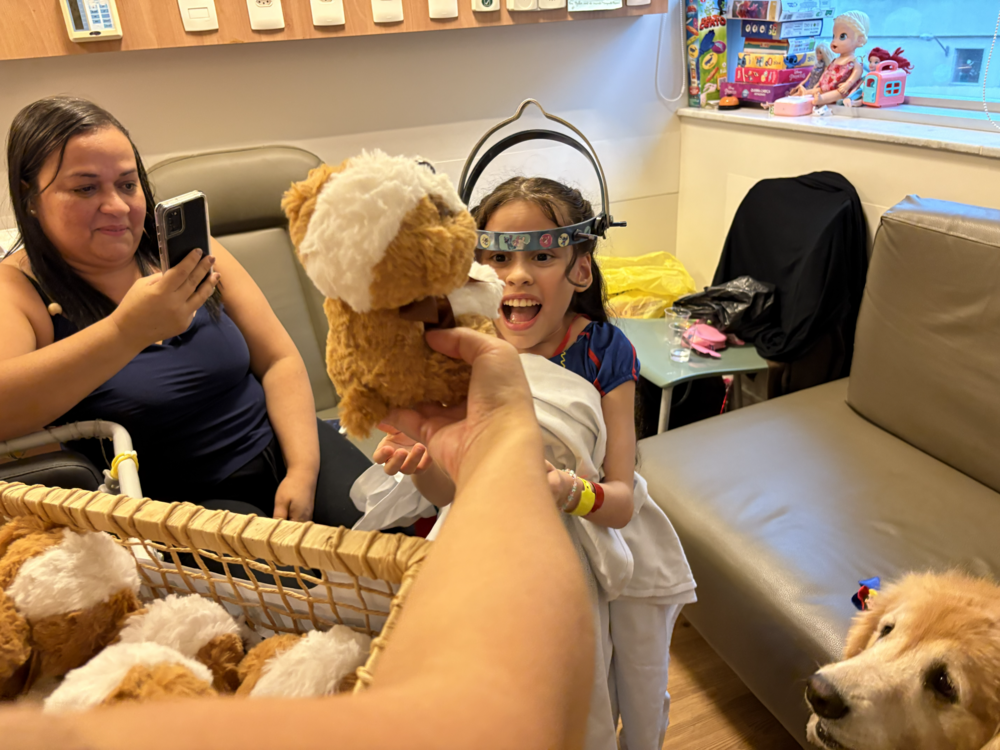 Durante a atividade, além da interação com as “doutoras” de quatro patas, as crianças internadas receberam um cachorrinho de pelúcia como lembrança, representando o carinho, a leveza e o cuidado que marcaram o dia. A proposta, criada com o objetivo de oferecer um momento especial e quebrar a rotina dos pacientes do Complexo Pediátrico da unidade, foi abraçada por diversos setores do hospital, incluindo SCHI, Pediatria, Hotelaria, Atendimento e Diretoria, que garantiram a segurança e o bem-estar de todos os envolvidos.