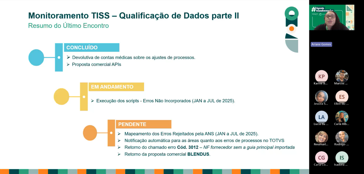 No dia 31 de outubro, 15 profissionais se reuniram em um encontro, que aconteceu em formato virtual, com o propósito de integrar as áreas envolvidas e compartilhar informações sobre os envios do Monitoramento TISS, destacando a importância do índice de completude dos dados e sua relação com o batimento entre TISS e DIOPS.